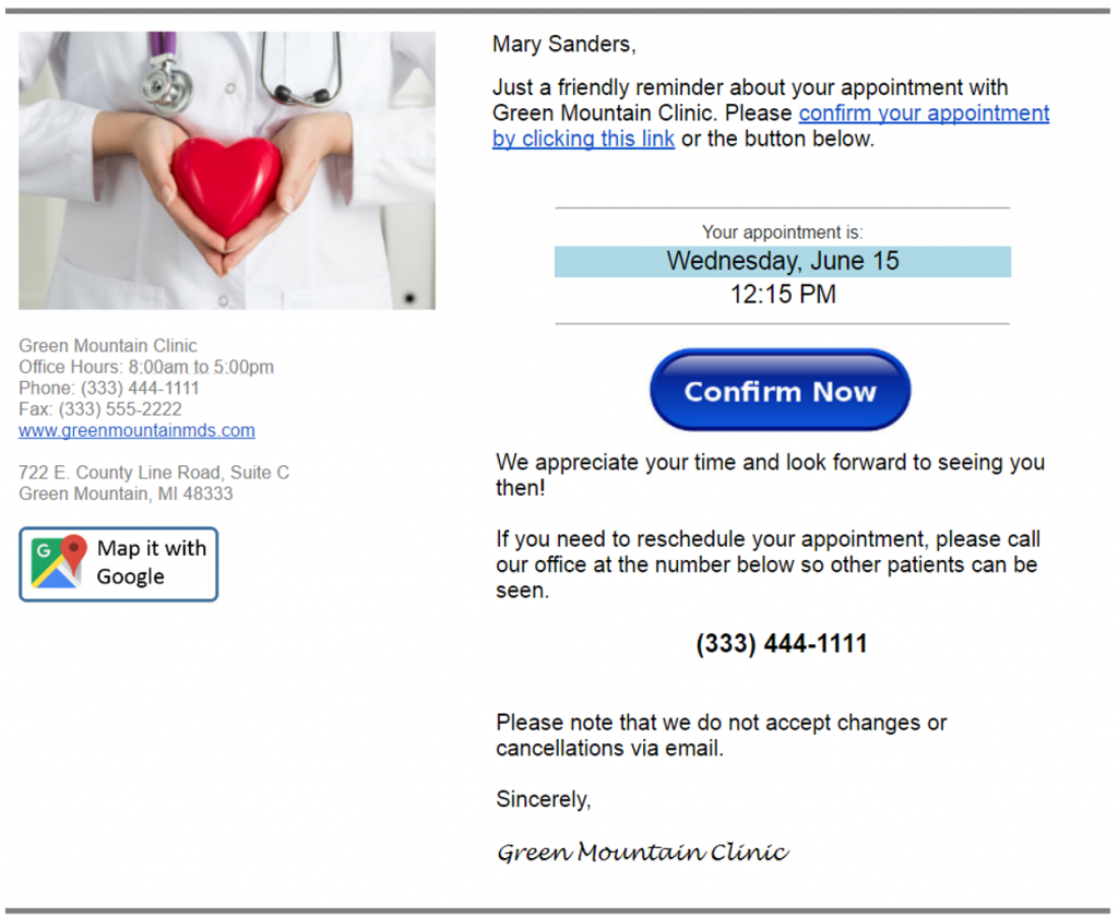 You can customize the language in the appointment reminder email based on your specific needs. Common customizations include new-patient welcomes, and other appointment specific preparation instructions.